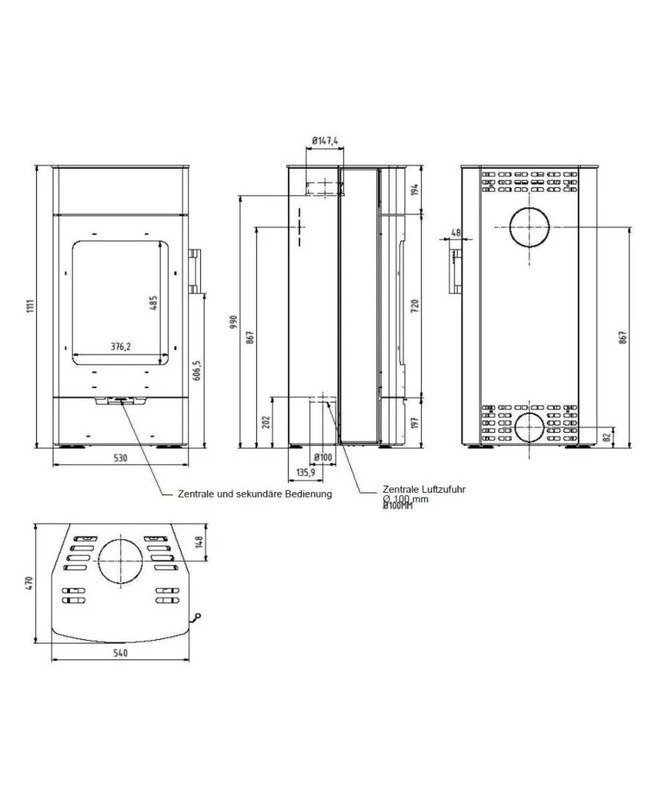 • Rauchrohranschluss: Ø 150 mm, oben oder hinten
